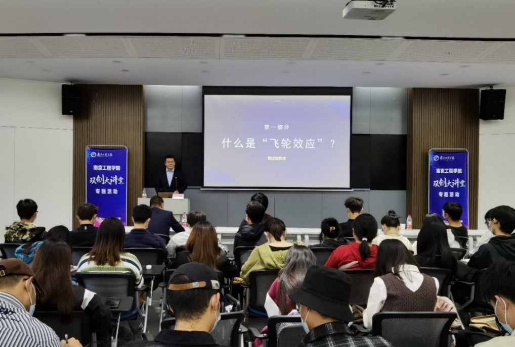 卫旺研究员是教育部首批特聘创新创业导师,江苏省特聘产业教授、苏北发展专家、双创导师团成员、产业研究院金牌导师,我校特聘双创导师,长期致力于绿色发展路径的设计和双碳科技成果的转化研究与实践。讲座中,他从如何“熬过临界点”打造飞轮效应、如何“锁定专属市场”做到精准定位、如何“融入生态 错位经营”构建独特的竞争策略、如何打造业绩倍增的“飞轮”创建自己的商业模式等四个方面,深入浅出地剖析了什么是系统化的创新创业能力,如何实现行稳致远的发展。他将“双创理论”与自己丰富的创新创业实践经历相结合,阐述了完整的创新创业项目组成,分析了项目全生命周期的迭代与完善路径。围绕“如何保持合理的发展速度”这一问题,卫旺提出,要打造属于自己的“首尾相连”的因果链,形成一圈一圈的“成长回路”,实现行则将至、行稳致远的发展。