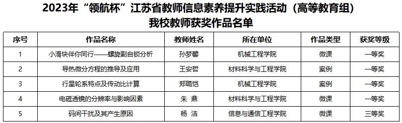 近日,由江苏省教育厅举办的2023年“领航杯”江苏省教师信息素养提升实践活动落下帷幕,我校推荐参赛的高等教育组5项参赛作品全部获奖,其中一等奖4项,三等奖1项。