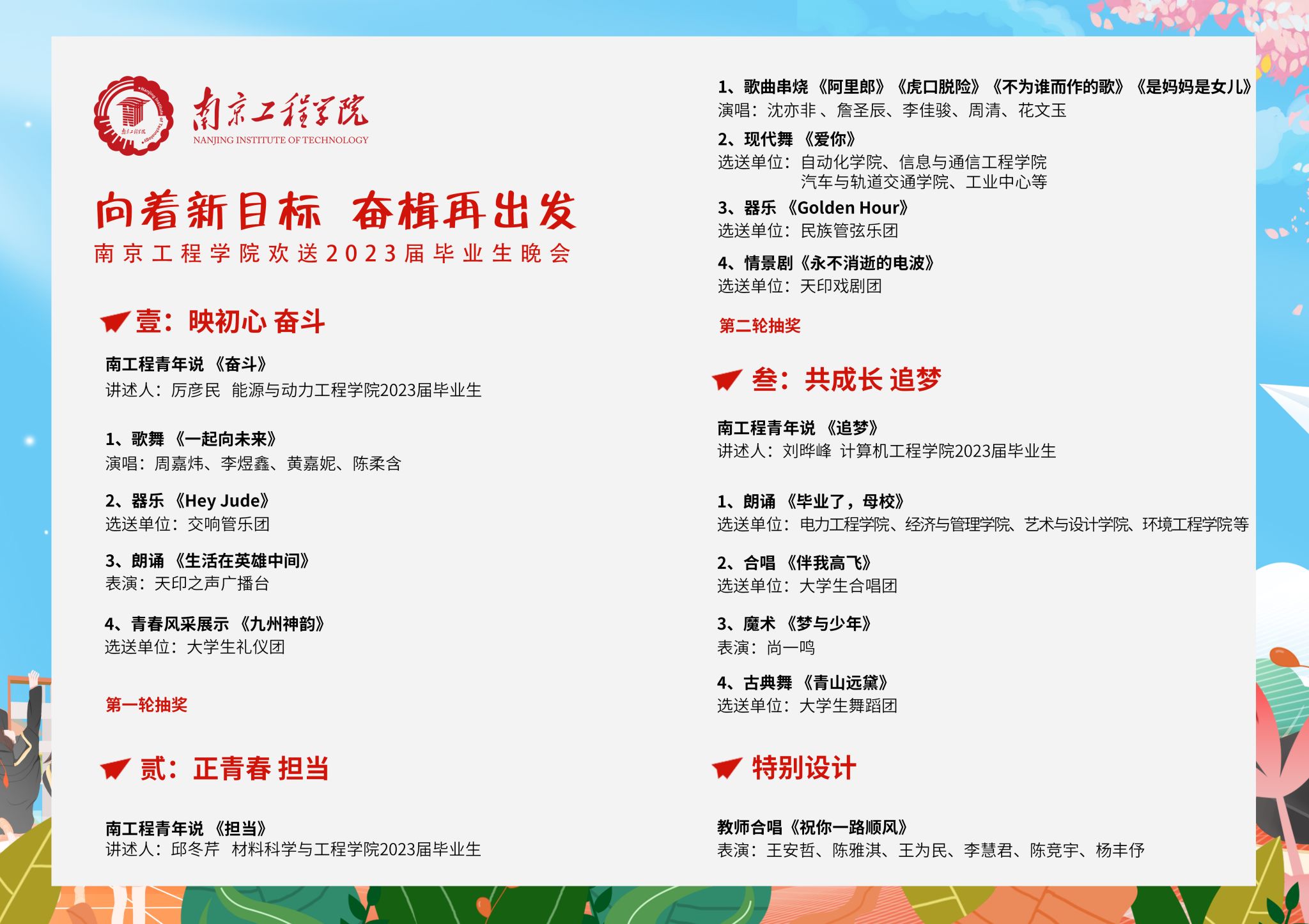 毕业季来临,为欢送2023届毕业生,表达母校对毕业生殷切的期望和美好的祝福,凯发决定举办 “向着新目标,奋楫再出发”欢送2023届毕业生文艺晚会,现将有关安排通知如下: