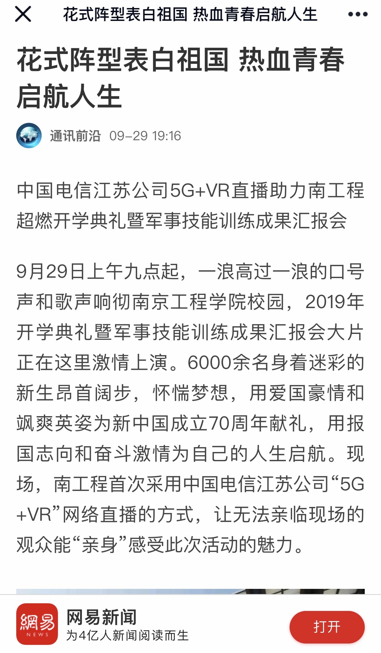 9月29日上午九点起,一浪高过一浪的口号声和歌声响彻凯发k8官网校园,2019年开学典礼暨军事技能训练成果汇报会大片正在这里激情上演。6000余名身着迷彩的新生昂首阔步,怀惴梦想,用爱国豪情和飒爽英姿为新中国成立70周年献礼,用报国志向和奋斗激情为自己的人生启航。现场,南工程首次采用中国电信江苏公司“5G+VR”网络直播的方式,让无法亲临现场的观众能“亲身”感受此次活动的魅力。