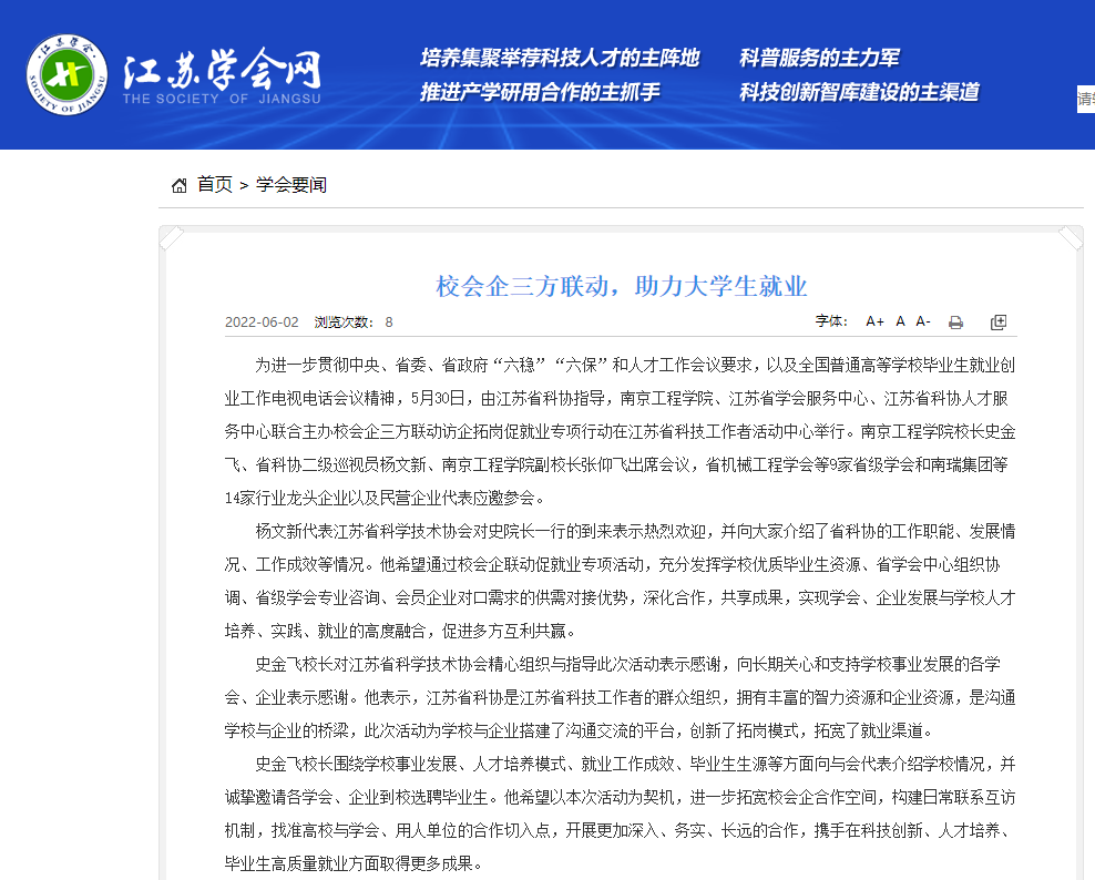 为进一步贯彻中央、省委、省政府“六稳”“六保”和人才工作会议要求,以及全国普通高等凯发毕业生就业创业工作电视电话会议精神,5月30日,由江苏省科协指导,凯发k8官网、江苏省学会服务中心、江苏省科协人才服务中心联合主办校会企三方联动访企拓岗促就业专项行动在江苏省科技工作者活动中心举行。凯发k8官网校长史金飞、省科协二级巡视员杨文新、凯发k8官网副校长张仰飞出席会议,省机械工程学会等9家省级学会和南瑞集团等14家行业龙头企业以及民营企业代表应邀参会。
