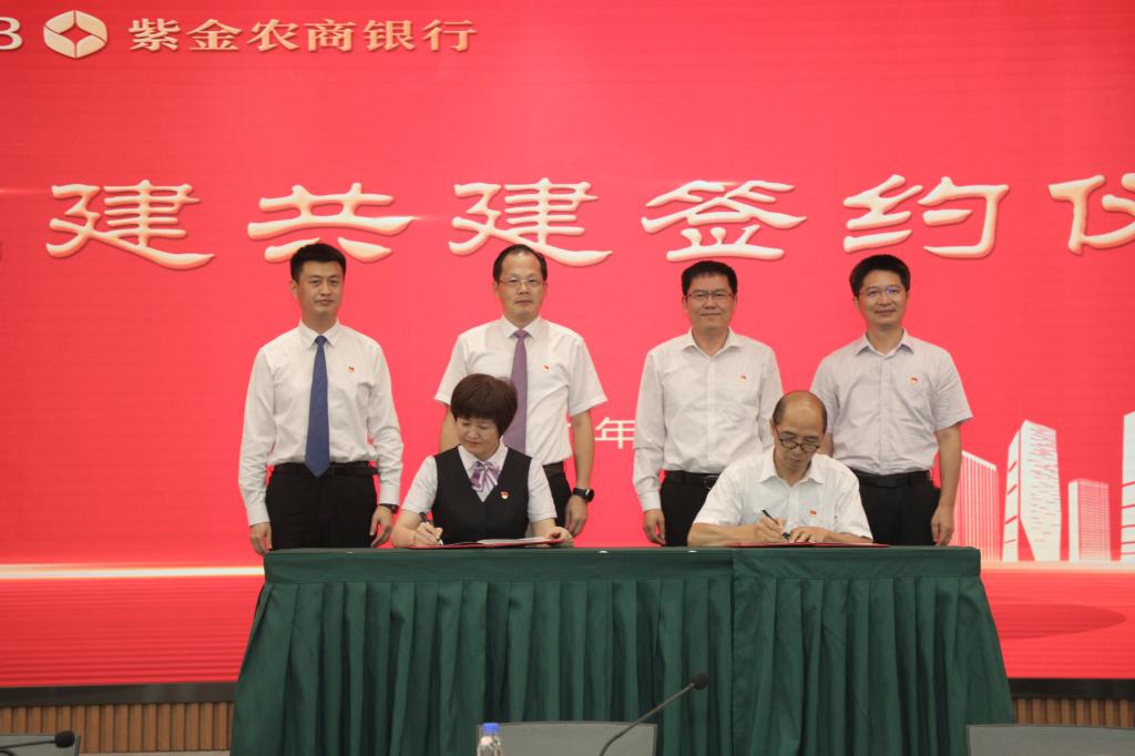 双方与会人员共同学习了习近平总书记在庆祝中国共产党成立100周年大会上的重要讲话,深刻领会讲话的丰富内涵,以伟大建党精神指导双方联学共建。经济与管理学院党委书记冯永伟与紫金农商银行江宁支行党委书记、行长吴家莉共同签署结对共建协议,校党委组织部部长朱松青与紫金农商银行人力资源部总经理林盛共同为实习研究基地揭牌,经济与管理学院党委书记冯永伟向紫金农商银行党群工作部总经理项生华授予“高校金融卫士志愿队”旗帜。
