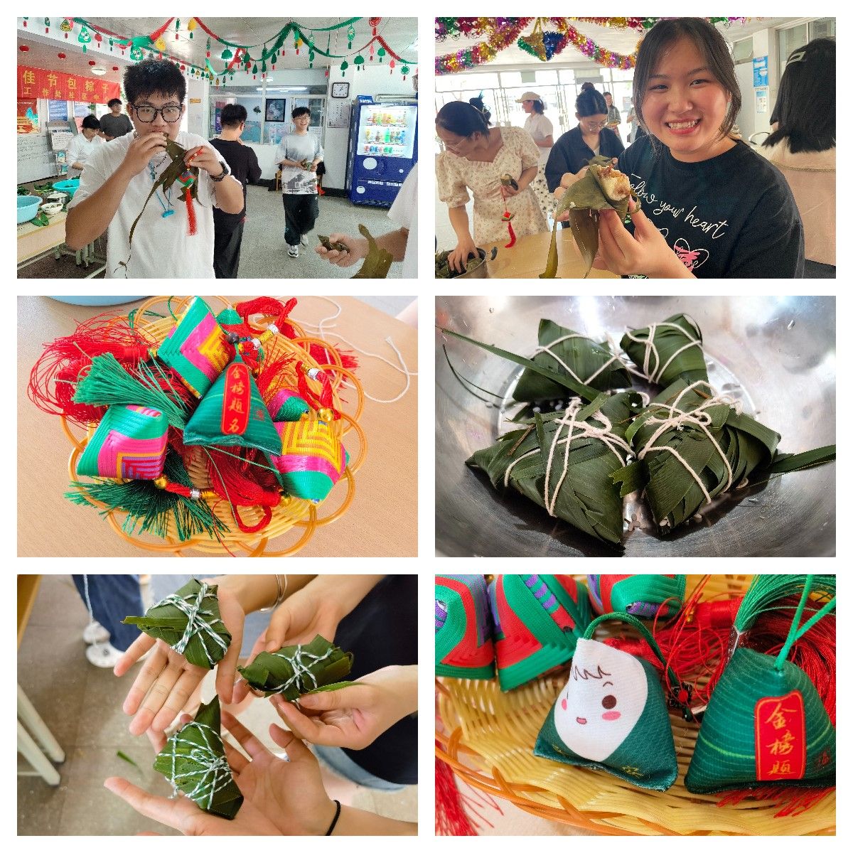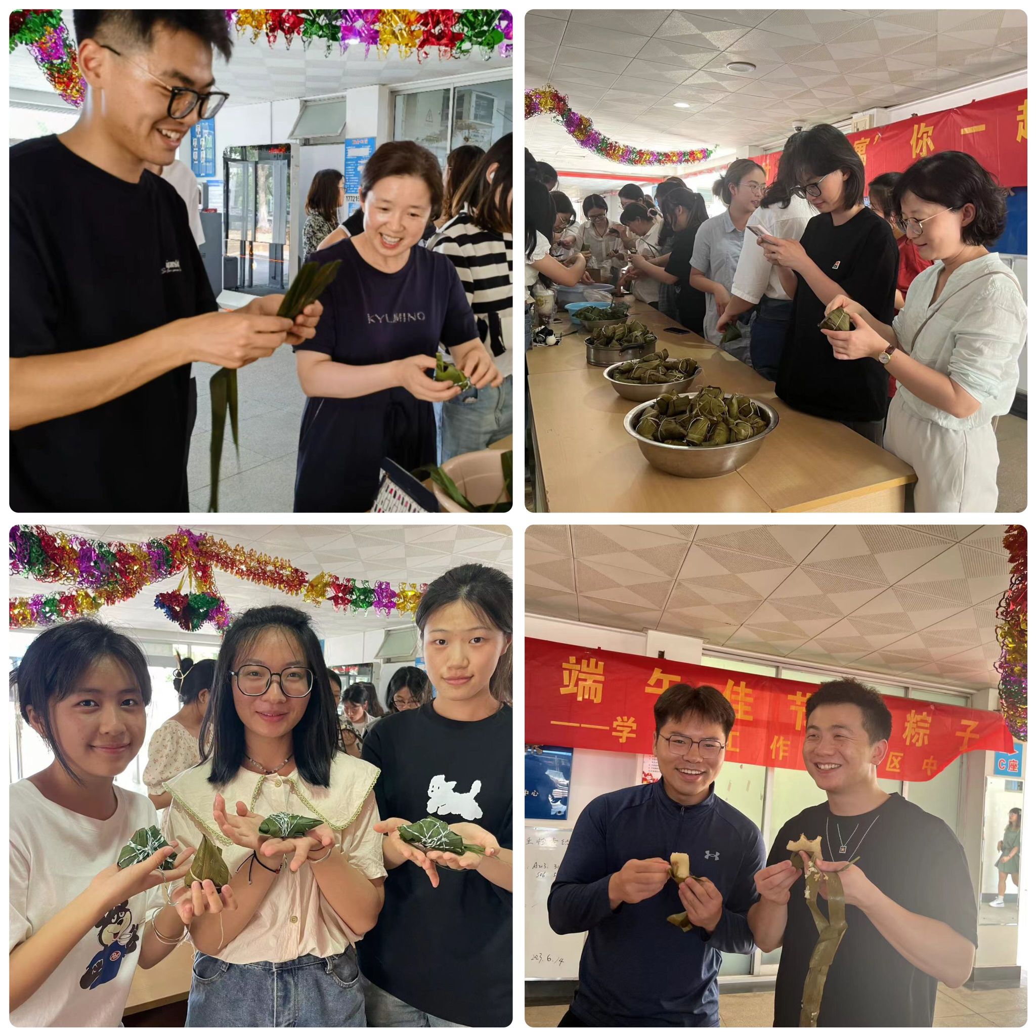 在老师的指导下,同学们亲手体验了卷粽叶、包糯米、放蜜枣、系粽绳,认真地学习各种手法和技巧。填米、裹粽、绑线,大家一边学习技巧,一边聊着生活学习中的各种趣事。一旁的宿管阿姨们看着屡屡出现“纰漏”的青年人,忍不住“施以援手”,活动现场笑声不断。很快地,一个个形态各异的粽子就诞生了。“参加此活动,让我学到了一个新技能,融入到传统节日的氛围中,也感受到了中华传统文化的魅力,其乐融融。”经济与管理学院造价211黄名澜同学感慨道。